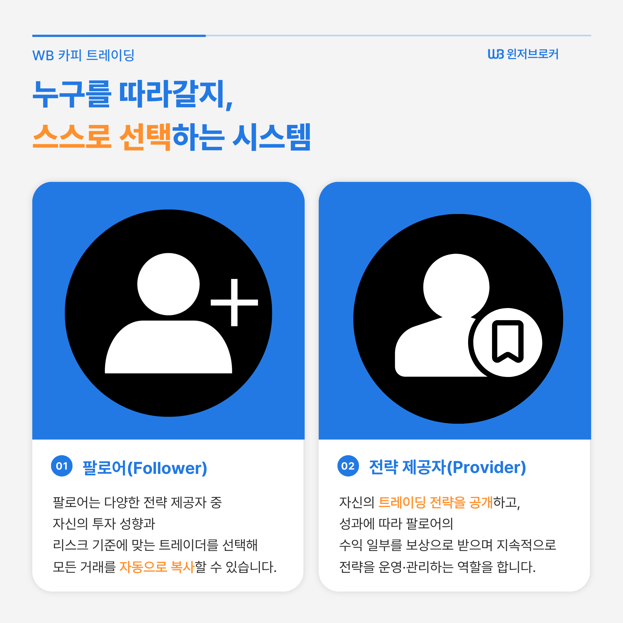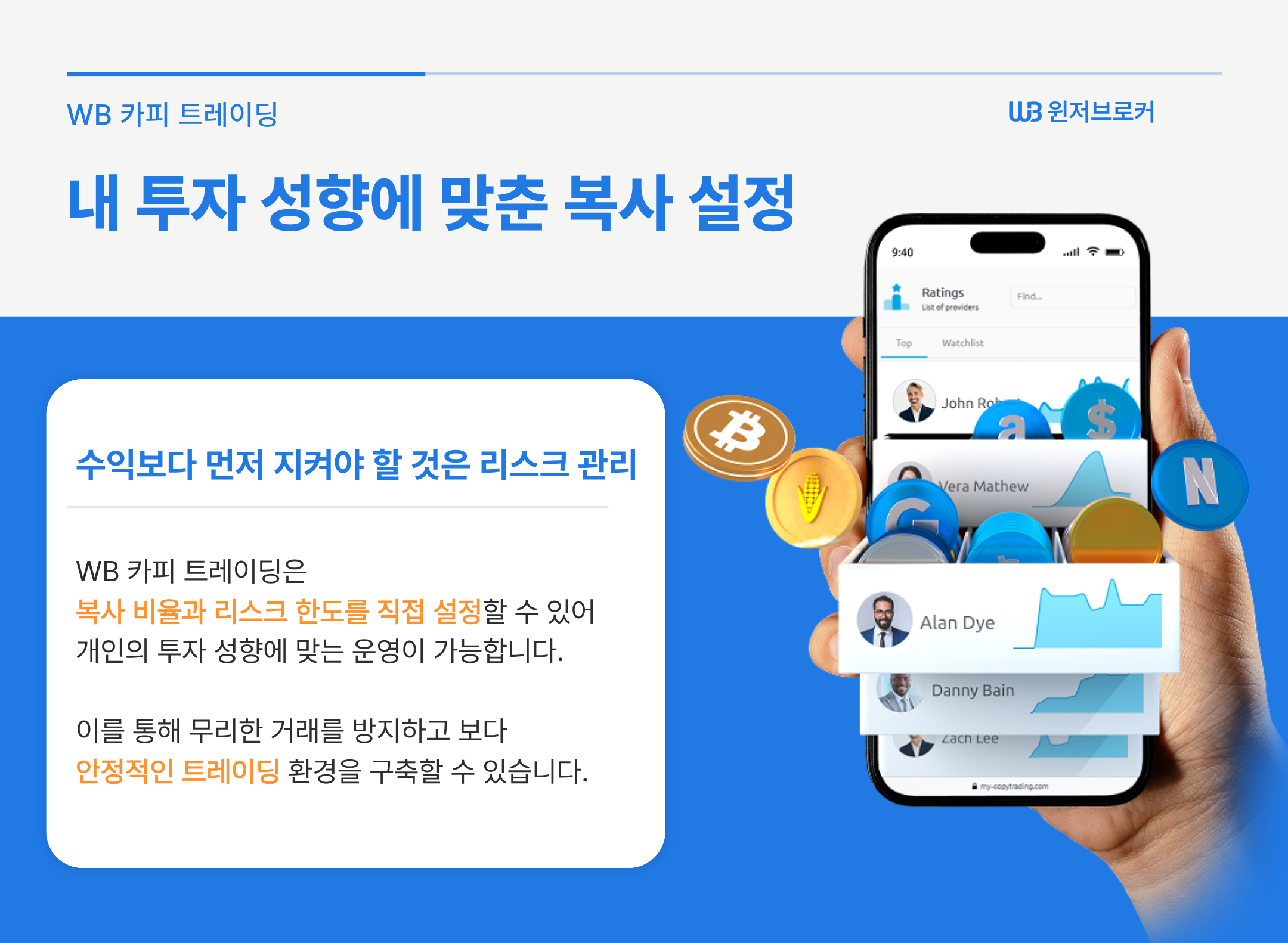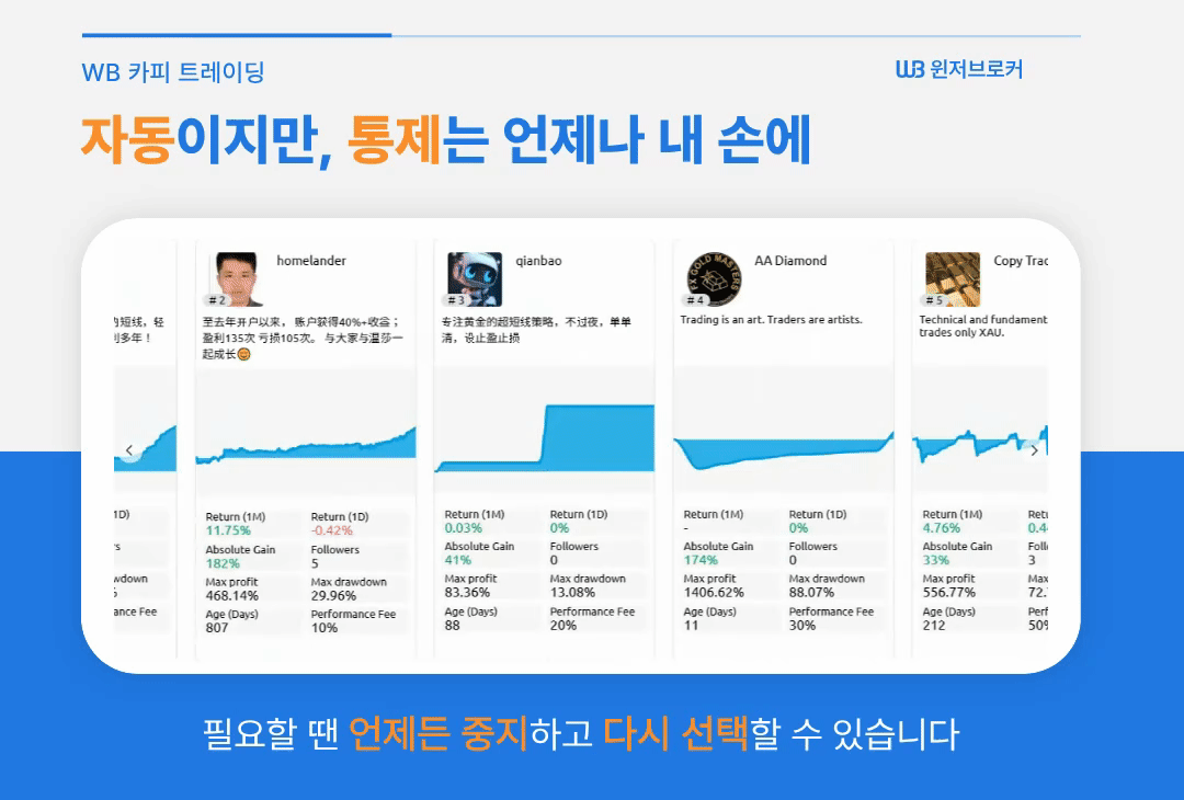WB 카피 트레이딩은 다른 트레이더의 전략과 실제 거래를 자동으로 복제하는 서비스입니다.