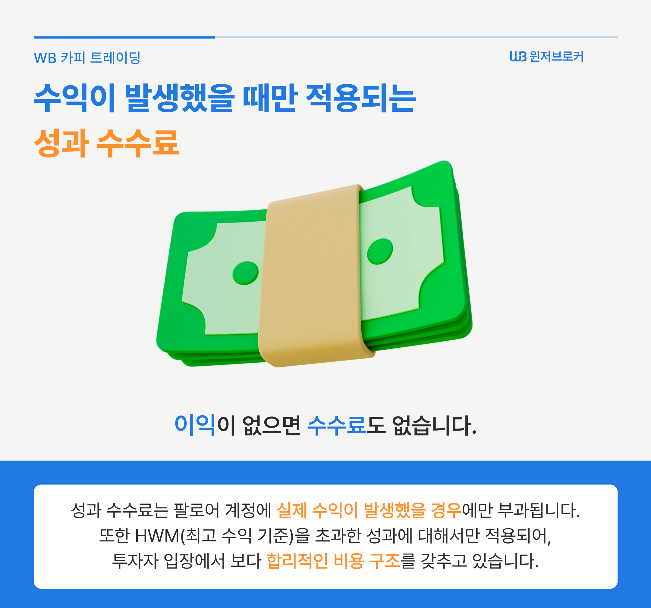WB 카피 트레이딩에서는 수익이 발생했을 때만 성과 수수료(Performance Fee)가 발생합니다.